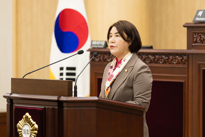 | ▲ 안산시의회 김유숙 의원이 5분 자유 발언을 하고 있다 /사진제공=안산시의회 |