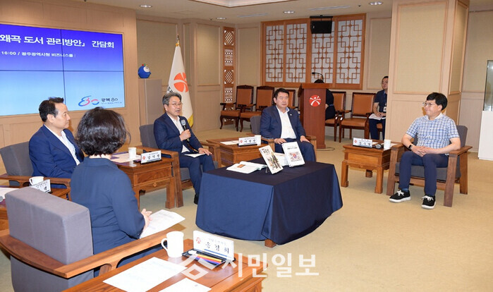 | ▲ 강기정 광주광역시장이 지난 11일 오후 시청 비즈니스룸에서 열린 ‘광복 80년, 역사왜곡 도서 관리방안’ 간담회에 참석, 이정선 광주시교육감, 임택 구청장협의회장(동구청장), 문수영 흥사단 청소년활동진흥센터장 등과 함께 역사왜곡 도서 등에 대한 대응방안을 논의하고 있다./ 광주광역시 제공 |