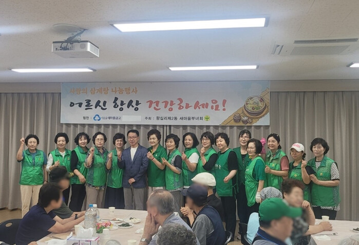 먼저 지난 16일 왕십리제2동 새마을부녀회는 홀몸노인 등 100명을 모시고 동주민센터 3층 다목적실에서 새마을부녀회 회원들이 행사 전날부터 직접 재료를 다듬고 정성껏 끓여낸 삼계탕을 대접했다. 아울러 이번 행사에는 서울숲새마을금고, 이든아이빌 등 지역내 기관도 후원에 참여했다.