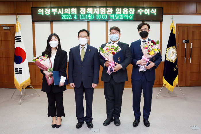 [의정부=최문수 기자] 경기 의정부시의회가 최근 시의회 3층 의원회의실에서 의원 의정활동을 지원하기 위해 신규 채용한 정책지원관 3명에 대해 임용장을 교부했다고 13일 밝혔다.