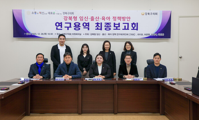 [시민일보 = 홍덕표 기자] 서울 강북구의회(의장 최치효) 의원연구단체 '강북형 임신, 출산, 육아정책 연구회'가 최근 의회 3층 의원회의실에서 '강북형 임신, 출산, 육아정책 제안을 위한 정책방안 연구용역 최종보고회'를 개최했다.