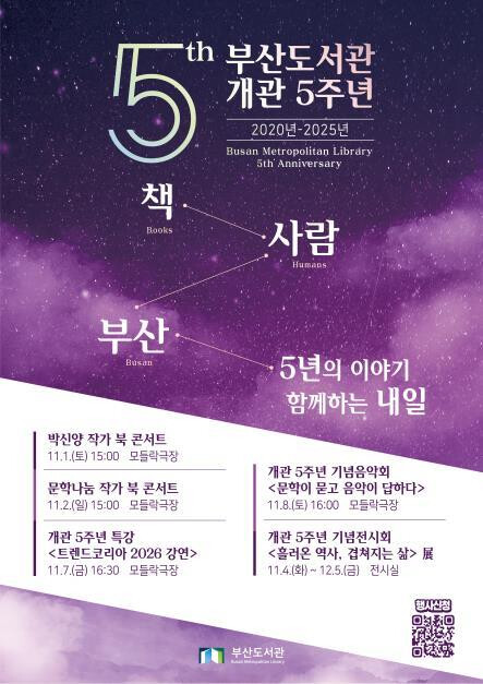 이번 기념행사는 <책, 사람, 부산 - 5년의 이야기, 함께하는 내일>이라는 주제로 ▲작가와의 만남(북 콘서트) ▲강연 ▲음악회 ▲전시회 등 다양한 문화 프로그램을 마련하여 시민과 도서관이 함께 호흡하는 축제의 장으로 펼쳐질 예정이다.