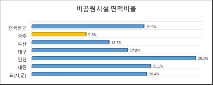 하지만 광주시는 비 공원시설 비율을 30%가 아닌 9.6%로 대폭 낮췄다. 이는 전국 평균 비 공원시설 비율 19.9%의 절반 수준으로, 전국에서 가장 낮다.