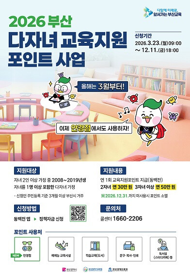 교육지원포인트 신청자격은 3개월 이상 부산시에 거주 중인 2자녀 이상 다자녀가정으로 이들 중 2008년부터 2019년생인 자녀가 1명 이상인 경우 지원대상이다. 지원금액은 2자녀 가정에는 연 30만원, 3자녀 이상 가정에는 연 50만원으로 교육지원포인트 형태로 지급한다.