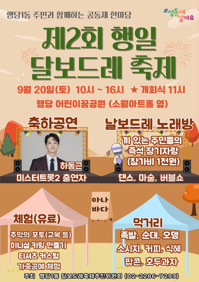 [시민일보 = 박소진 기자] 성동구(구청장 정원오) 행당제1동은 오는 20일 행당 어린이꿈공원에서 ‘제2회 행일 달보드레 축제’를 개최한다고 밝혔다.