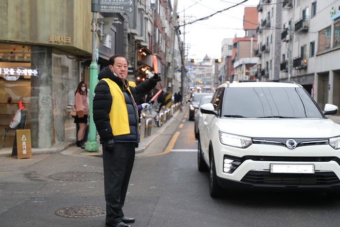 유동균 서울 마포구청장이 최근 망원1-2 공영주차장 앞 도로 교통정리 봉사에 나섰다. 이곳은 주말이 되면 망원시장과 망리단길을 방문하는 시민들로 진출입로 혼잡도가 높아 주민 민원이 많이 제기되고 있다. 사진은 망원1-2 공영주차장 앞 도로 교통정리 봉사에 나선 유 구청장의 모습. (사진제공=마포구청)