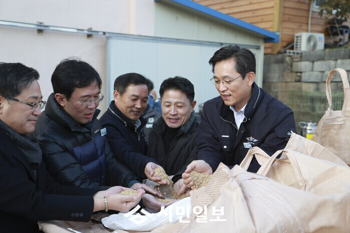 | ▲ 우승희 영암군수(오른 쪽 첫 번째)가 지난 2024 영암군 추곡 수매 현장을 찾아 톤백벼 품질을 살피고 있다. / 자료사진 = 영암군 제공 |