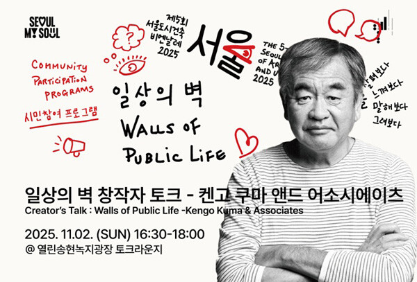 오는 11월 2일(일) 오후 4시 30분, 서울공예박물관 강당에서 켄고 쿠마가 직접 시민들과 만나는 특별 토크 세션이 열린다. 시민참여 프로그램의 하나로 기획된 이번 창작자 토크는 그의 주요 작업을 소개하고 《휴머나이즈 월(Humanise Wall)》과 ‘인간적임’의 연관성, 휴먼 스케일 재해석의 필요성을 주제로 담론을 나누는 자리다. 전통적 재료와 장인적 기법을 현대적으로 풀어내는 그의 시선은, 도시와 건축을 보다 따뜻하고 인간적인 차원에서 바라보게 한다.