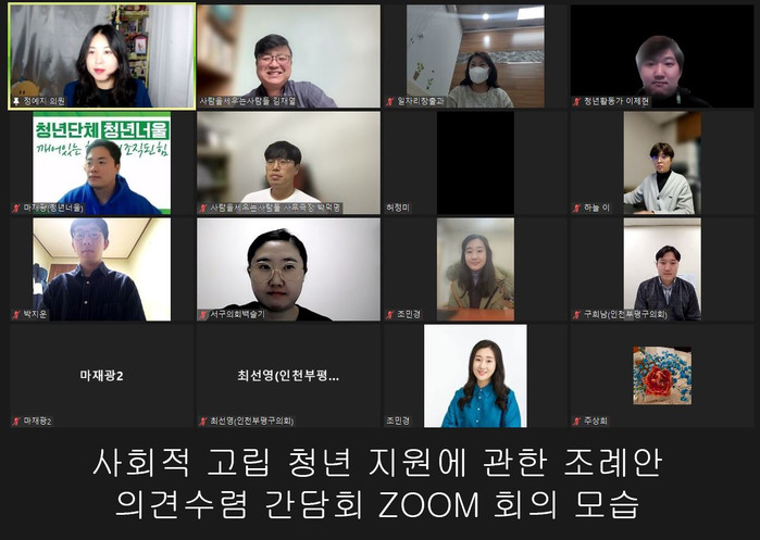 [인천=문찬식 기자] 정예지 인천 부평구의회 의원이 최근 ZOOM 온라인 화상회의를 통해 간담회를 열고 ‘인천광역시부평구 사회적 고립청년 지원에 관한 조례안’ 발의를 위한 의견을 수렴했다.