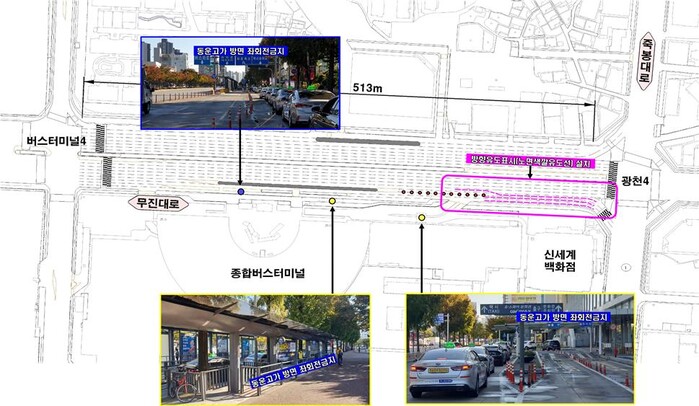주요 공사 내용은 터미널 내부에서 진출하는 차량이 광천사거리에서 우회전해 교원공제사거리에서 유턴 후 동운고가 방면으로 이동할 수 있도록 도로 노면에 방향유도 표시(노면색깔유도선)를 설치했다.