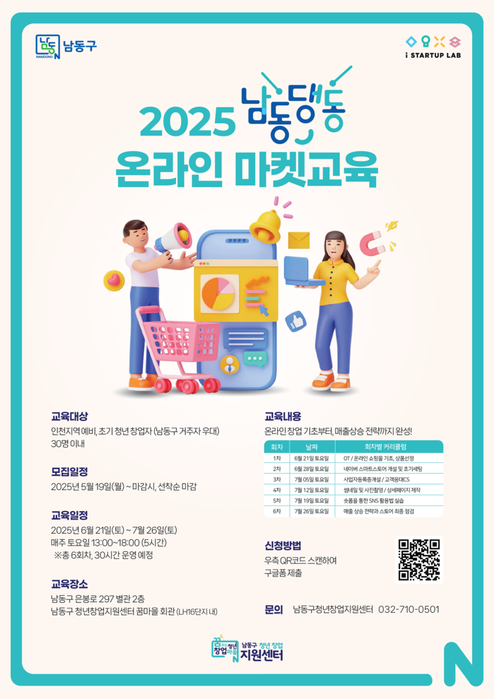 [인천=문찬식 기자] 인천 남동구 청년창업지원센터는 청년 창업자의 온라인 시장 진출을 돕기 위한 ‘2025 남동댕동 온라인 마켓교육’ 프로그램을 운영한다고 26일 전했다.