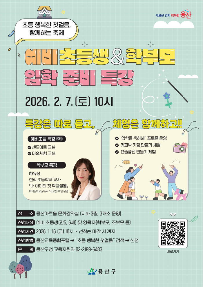 참여 대상은 예비 초등학생(만 5~6세)과 보호자 등 총 150명이며, 참여 신청은 용산구 교육종합포털을 통해 온라인으로 가능하다. 학부모 특강에 한해 행사 당일 현장 접수도 병행 운영한다.