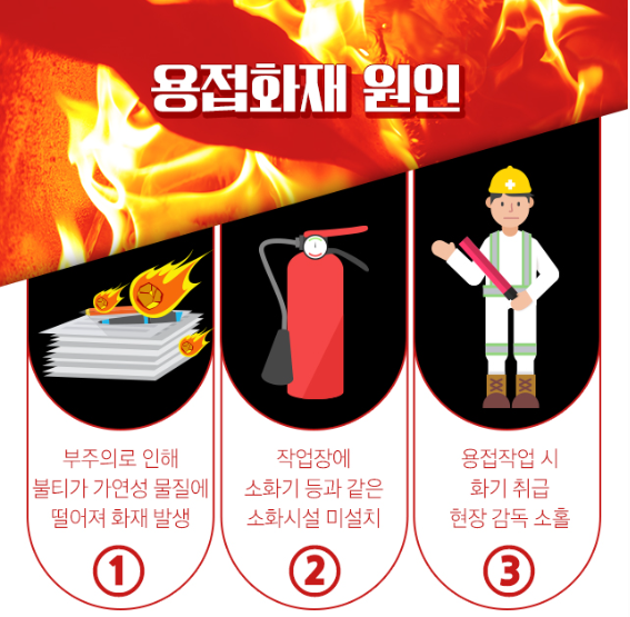 이에 소방서는 ‘용접기기 등 화기 취급 공사장 기준에 맞는 임시소방시설 설치 ▲화재감시자 의무배치 여부 확인’, ‘작업 전 안전관리자에 통보’, ‘용접 ·용단 시 주변 가연물 제거’, ‘용접 작업 후 30분 이상 잔불 감시’ 등을 강조하고 있다.
