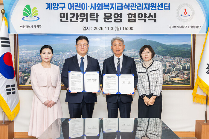 [인천=문찬식 기자] 인천 계양구(구청장 윤환)는 지난 3일 경인여자대학교 산학협력단과 계양구 어린이·사회복지급식관리지원센터 민간위탁 운영 협약을 체결했다.