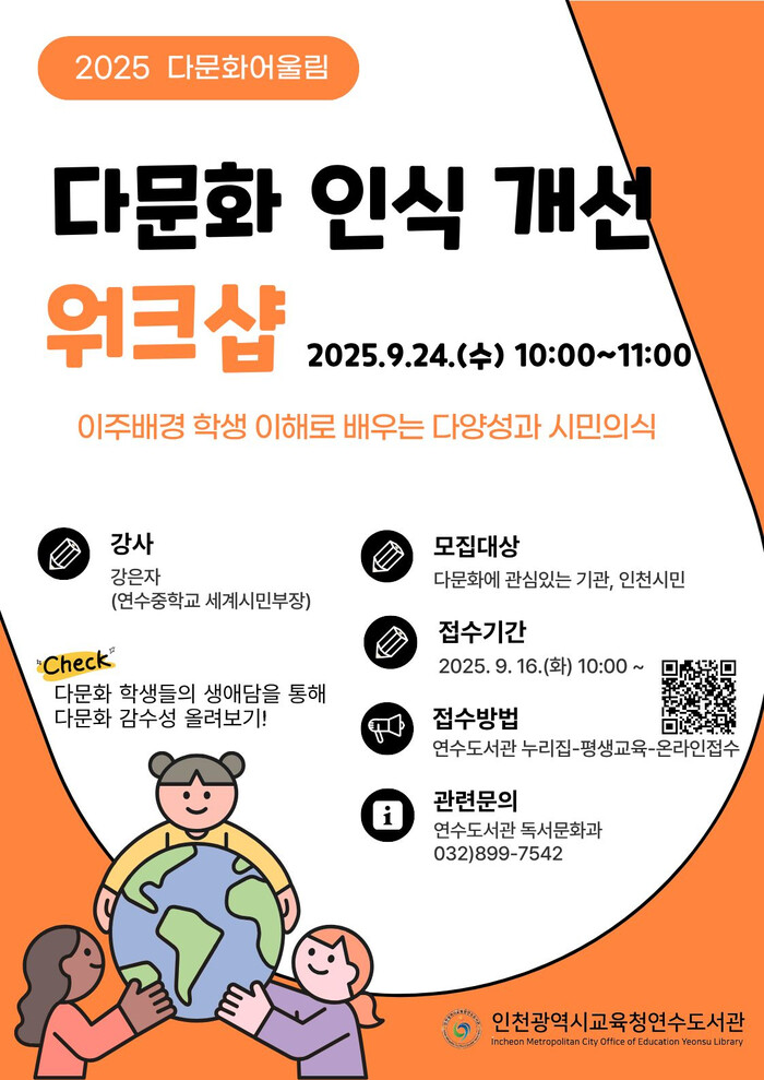 모집 대상은 다문화에 관심 있는 기관과 인천 시민 누구나 가능하며, 참여 신청은 9월 16일(화) 오전 10시부터 연수도서관 누리집 ‘평생학습-온라인접수’에서 가능하다.
