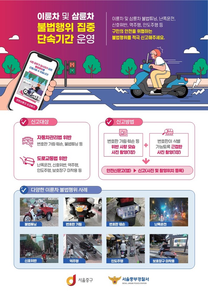 [시민일보 = 여영준 기자] 서울 중구는 오는 8월 말까지 이륜차와 삼륜차의 불법행위 개선을 위한 합동 캠페인과 함께 지도·단속을 실시한다.