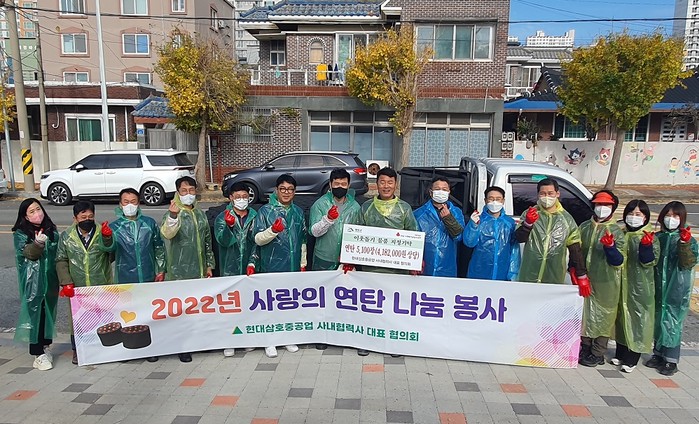 | ▲ 영암현대삼호중공업 사내협력사대표협의회, 사회복지공동모금회를 통해 마련한 사랑의 연탄 5,100장 지난 17일 영암군 기탁 후 기념촬영 / 영암군 제공 |