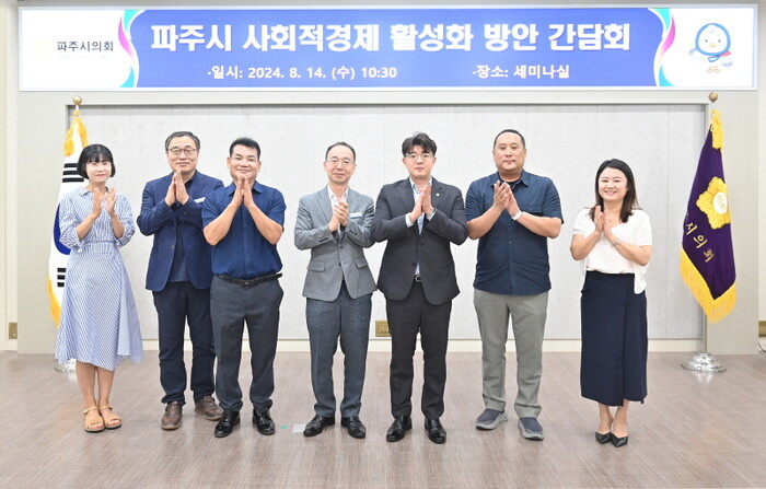 16일 시의회에 따르면 이날 간담회에는 사회자 목진혁 의원을 비롯해 이정은 의원과, 파주시 일자리경제과장 등 관계 공무원, 파주시 사회적경제·마을공동체 지원센터 박영민 센터장, 파주시 사회적경제기업협회 박명준 회장, 방미나 사무국장 등 총 8명이 참석했다.