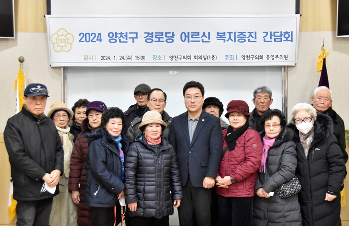 [시민일보 = 이대우 기자] 유영주 서울 양천구의회 의원(목1동, 신정1·2동)이 최근 구의회 1층 회의실에서 경로당 내 운영프로그램 활성화 및 시설 개·보수 강화를 통해 노인 복지 향상에 기여하는 방안 모색을 주제로 ‘2024 양천구 경로당 어르신 복지증진 간담회’를 개최했다.