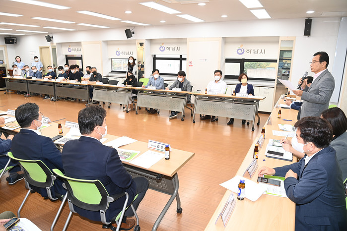 | ▲ 11일 열린 황산숲 산책로 조성을 위한 주민설명회에서 이현재 시장(오른쪽)이 발언을 하고 있는 모습. (사진제공=하남시청) |