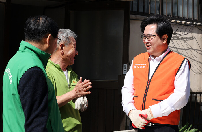 | ▲ 지난 4월, 서울 동작구 사당동 소재 빌라에서 진행된 ‘동작 러브하우스’ 집수리 지원 현장에서 박일하 구청장(오른쪽)이 해당 주민과 대화하고 있다. (사진=동작구청 제공) |