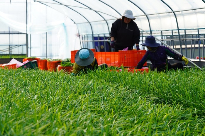 | ▲ 해남군 북일면 소재 겨울부추 생산농가들이 하우스시설에서 재배한 부추를 수확하고 있다. / 사진=해남군 제공 |