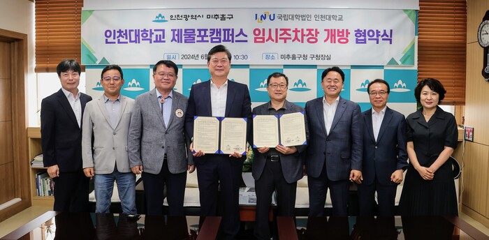 [인천=문찬식 기자] 인천 미추홀구가 24일 구청장실에서 인천대학교와 ‘인천대학교 제물포캠퍼스 임시주차장 개방 협약식’을 체결했다.