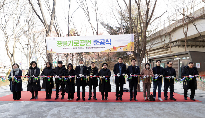 오승록 서울 노원구청장이 공릉가로공원에서 진행된 '공릉가로공원 정비사업' 준공식에 참석했다. 이번 공원 정비를 통해 ▲스마트쉼터 설치 ▲가로노점 정비 ▲이끼정원 조성 ▲진입로 2곳 추가설치 ▲휴게시설 확충 ▲광장마루 및 수경시설 조성 등 다양한 시설이 새롭게 단장됐다. 사진은 오 구청장(오른쪽 여섯 번째)이 테이프커팅식을 진행하는 모습. (사진=노원구청 제공)
