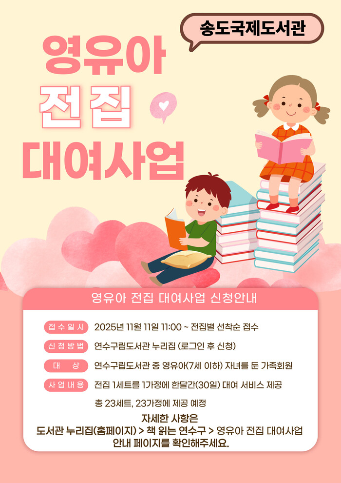 [인천=문찬식 기자] 인천 연수구(구청장 이재호) 송도국제도서관은 오는 11일부터 7세 이하 영·유아 가정을 대상으로 ‘전집 대여 서비스’를 새롭게 운영한다.