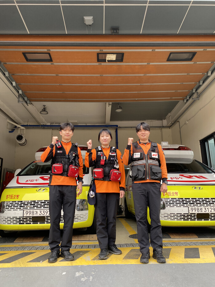 | ▲ 경기도소방본부 홈페이지 ‘칭찬합시다’ 게시판에시흥소방서 군서119안전센터 소속 소방위 김경미, 소방사 강승연, 박찬혁 구급대원이 환자의 상태를 신속히 확인하고 응급처치를 시행했다는 글이 올라왔다 /사진제공=시흥소방서 |