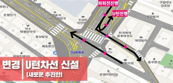 | ▲ 동작구 신상도초등학교 사거리 좌회전 및 U턴 차선 신설(안). |