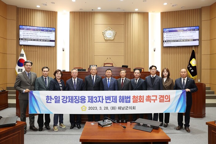 해남군의회 총무위원회 위원장인 박상정 의원은 ‘한·일 강제징용 제3자 변제 해법 철회 촉구 결의안’을 대표 발의했고, 군의회 의원 11명 전원이 공동발의에 참여했다.