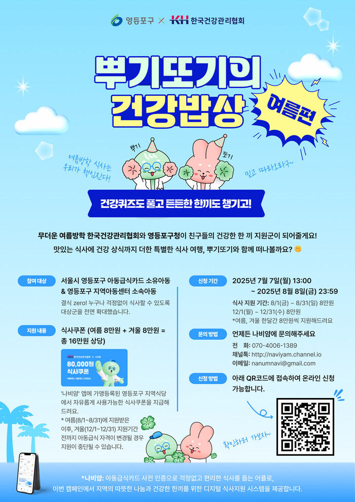 또한 구는 결식 우려 아동 지원을 강화하기 위해 민간 후원기관과의 협력도 확대했다. 최근 한국건강관리협회, 나눔비타민(주)와 ‘뚜기뽀기의 건강밥상’ 업무협약을 체결하고, 지역 내 돌봄이 필요한 아동 800여 명에게 1인당 8만 원 상당의 모바일 식사쿠폰을 지급한다. 쿠폰은 여름방학(8월)과 겨울방학(12월) 두 차례 지급돼 아동 1인당 총 16만 원을 지원한다.