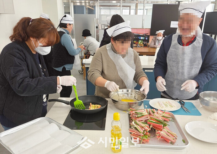 | ▲ ‘1313 이웃살핌’에 이웃지기, 살핌이웃으로 함께 요리 수업 자조모임에 참여한 주민들이 요리를 배우고 있다. / 광주광역시 광산구 제공 |