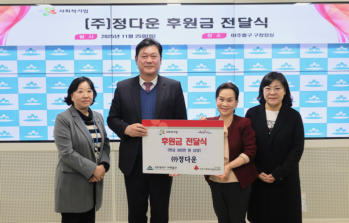 [인천=문찬식 기자] 인천 미추홀구(구청장 이영훈)는 지난 25일 구청장실에서 사회적기업 ㈜정다운(대표 장옥순)으로부터 지역사회 나눔 실천을 위한 성금 300만 원을 전달받았다.