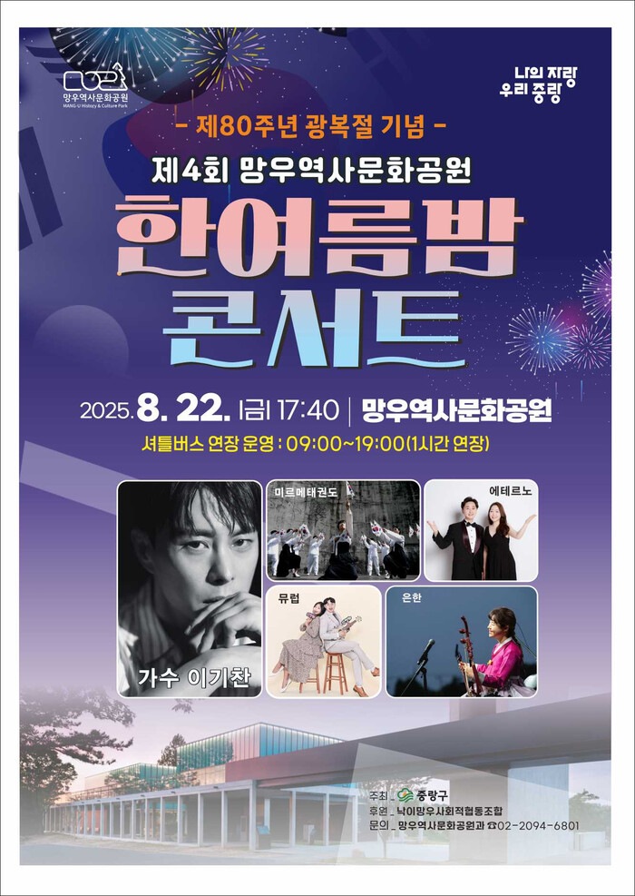 [시민일보 = 여영준 기자] 중랑구(구청장 류경기)가 22일 망우역사문화공원의 중랑망우공간에서 제80주년 광복절을 기념하는 ‘제4회 망우역사문화공원 한여름밤 콘서트’를 개최한다.