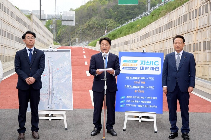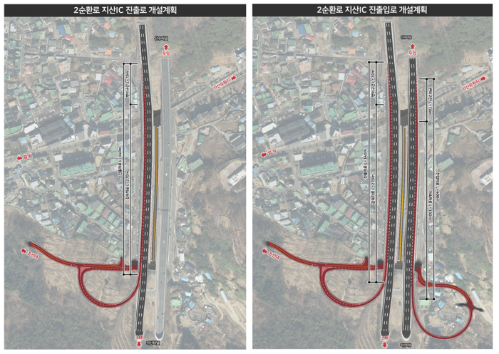 폐쇄하려 했던 지산IC 좌측진출로 시설물(옹벽)을 높여 제2순환도로와 수평을 맞춘 뒤 좌측으로 차로를 넓히면 기존 3개 차로에서 4개 차로로 확장할 수 있고, 확장된 도로를 포함해 좌측 3개 차로를 주행차로로, 맨 우측 차로를 진출차로로 분리 운행하면 사고 위험을 해소할 수 있다는 것이다.