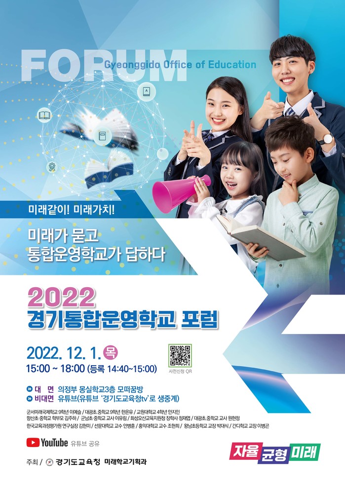 포럼 현장에는 통합운영학교 관계자 등 사전신청자 110여명이 참석 예정이다. 오후 3~6시 유튜브 ‘경기도교육청TV’ 채널을 통해 생중계하므로 통합운영학교에 관심 있는 누구나 온라인으로 참여할 수 있다.