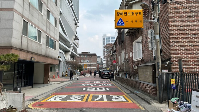 | ▲ 성동재활의원’ 정문 앞 도로가 지역내 최초 ‘장애인보호구역’으로 지정된 모습 . (사진=성동구청 제공) |
