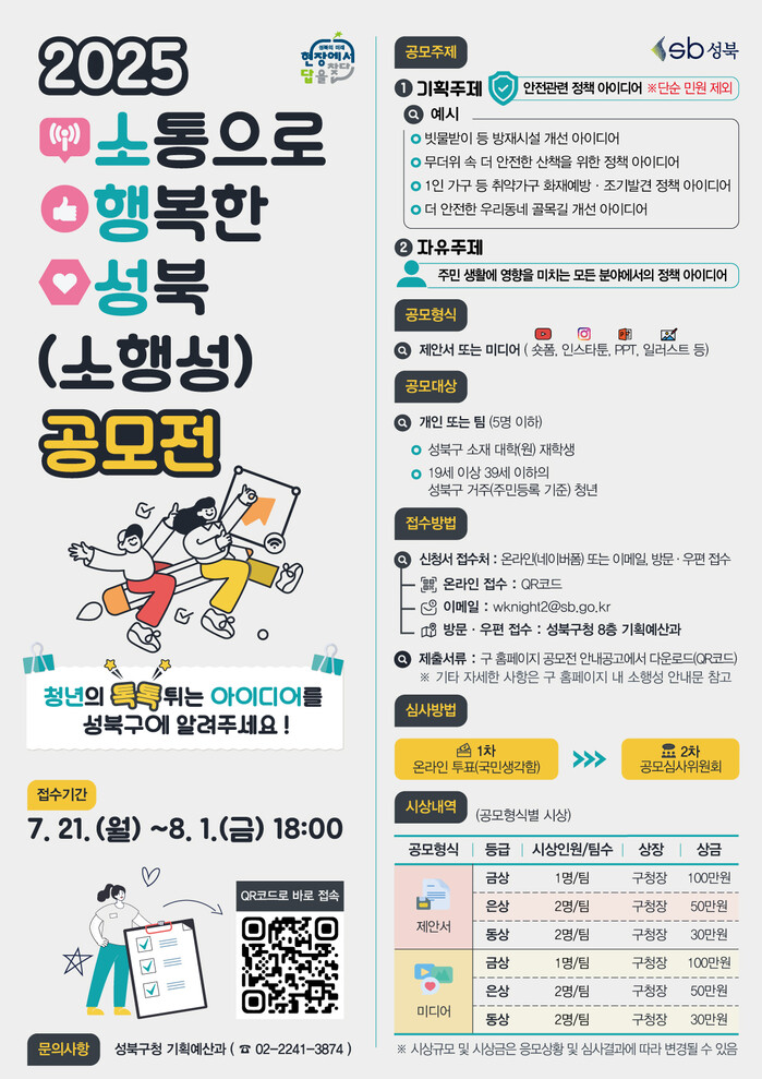 [시민일보 = 문민호 기자] 성북구(구청장 이승로)가 지역내 거주 청년과 구 소재 대학교 대학생을 대상으로 '2025 소통으로 행복한 성북' 공모전을 개최했다고 25일 밝혔다.