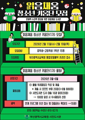 ‘읽음채움 도서관’에 참여할 ‘어린이 탐구단’과 ‘청소년 키움단(1기)’은 11일부터 부산광역시교육청 통합 예약포털 을 통해 온라인 접수를 진행한다. 어린이 읽음채움 도서관은 어린이실 , 청소년 읽음채움 도서관은 어문학실 으로 문의하면 된다.