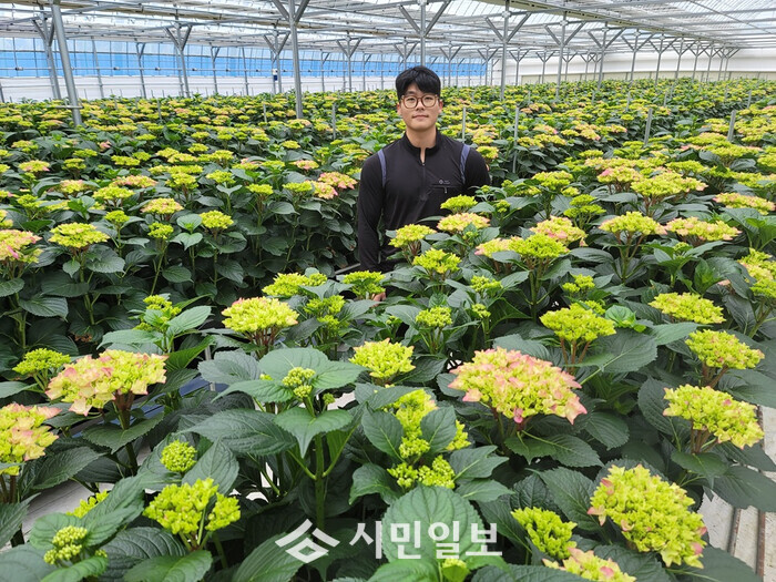 김승찬 대표는 한국농수산대학 화훼학과 출신의 청년 농업인으로, 2023년부터 현대식 스마트팜 하우스를 신축해 수국 재배를 본격화했다. 첫 해부터 우수한 품질로 농촌진흥청과 전남농업기술원 등 전문기관의 품종 협력 농가로 선정되었고, 일본 수출 실적도 거두며 기술력과 시장성을 동시에 입증했다.