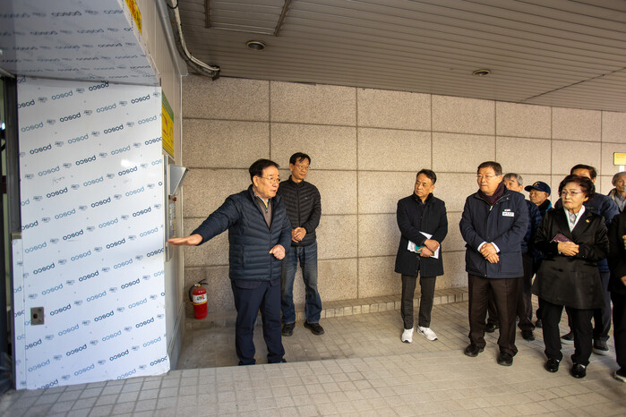 | ▲ 김경호 구청장(왼쪽 네 번째)이 새로 완공된 주차장 시설을 둘러보고 있다. (사진=광진구청 제공) |