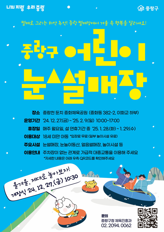 [시민일보 = 여영준 기자] 서울 중랑구(구청장 류경기)는 겨울방학을 맞아 지역 어린이들을 위한 중랑구 어린이 눈썰매장을 27일부터 오는 2025년까지 2월9일까지 운영한다.