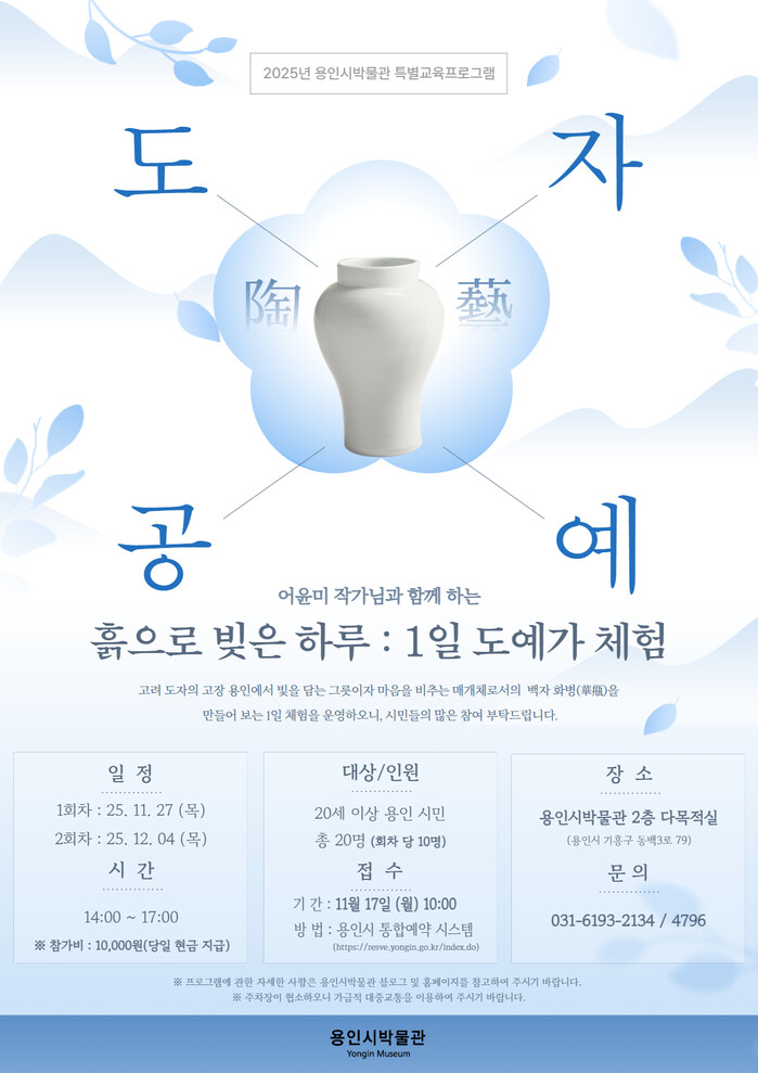 이번 프로그램은 어윤미 작가와 함께 백자 화병을 직접 만들어보는 참여형 교육으로, 흙을 다루며 고려 도자의 빛과 멋을 느낄 수 있는 기회를 제공한다. 참가자들은 흙이 화병으로 빚어지는 과정을 체험하면서 마음을 비우고 집중하는 도예의 매력을 경험하는 시간을 갖게 된다.