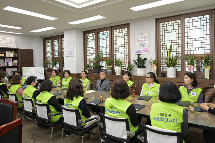중구가 최근 두 차례에 걸쳐 마을클린코디 30여명과 간담회를 했다. 간담회에서 김길성 구청장은 마을클린코디에게 위촉장을 수여하며 감사와 격려를 전했다. 사진은 김 구청장(가운데)이 마을클린코디들과 이야기를 나누고 있는 모습. (사진=중구청 제공)