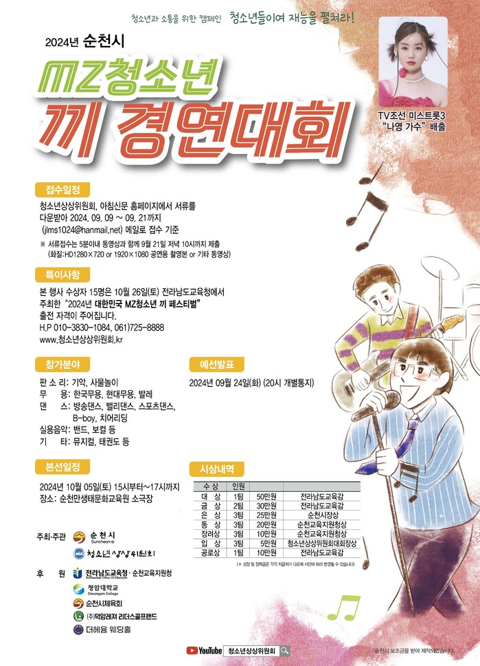 순천시(시장 노관규)는 청소년상상위원회(대회장 이상대)가 개최하는 “제7회 순천시 청소년 끼 경연대회”를 오는 10월05일(토) 오후 3시부터 6시까지 순천만생태문화교육원 공연장에서 열린다고 전했다.