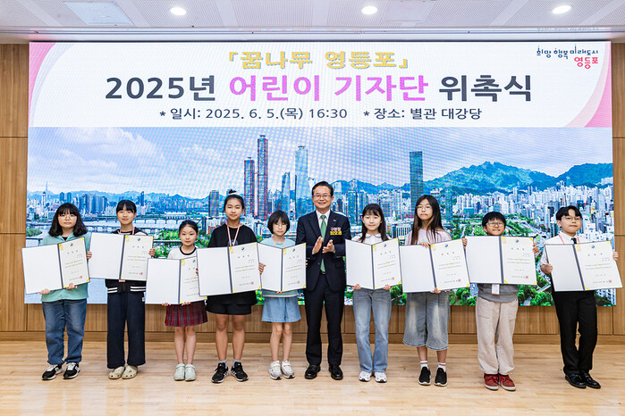영등포구가 지난 5일 구청 별관 5층 강당에서 '꿈나무 영등포' 2025년 어린이 기자단 위촉식을 진행했다. 사진은 위촉식에 참석한 최호권 구청장(가운데)이 어린이 기자들과 기념촬영을 하고 있는 모습. (사진=영등포구청 제공)