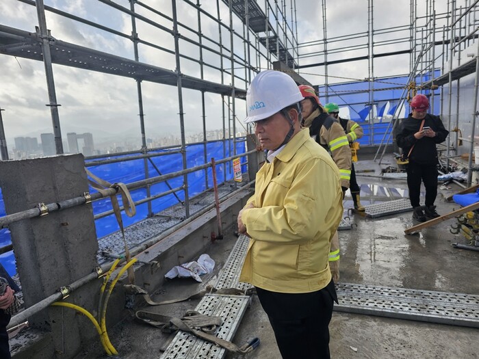 | ▲ 지난 6일 박강수 구청장이 가설물 기울임 현상이 발생한 공사장 현장을 찾아 원상 복구된 가설물을 점검하고 있다. (사진=마포구청 제공) |