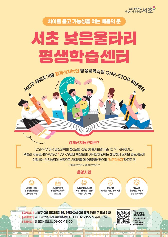 전성수 구청장은 “서초 낮은울타리 평생학습센터는 경계선지능인들이 자신에게 맞는 배움을 이어가고 사회 속에서 당당하게 성장할 수 있도록 돕는 든든한 기반”이라며 “앞으로도 경계선지능인에 대한 인식개선과 맞춤형 교육 지원을 확대하며 누구도 소외되지 않는 따뜻한 교육 도시 서초를 만들어 가겠다”고 말했다.